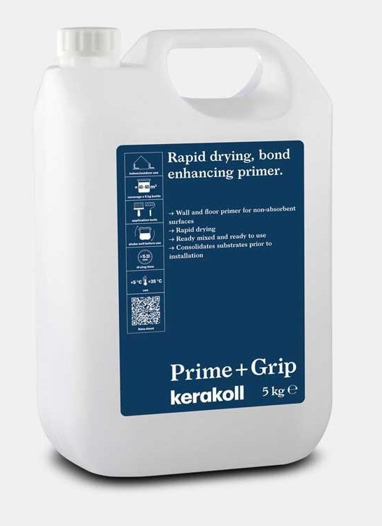 Kerakoll Prime+ Grip is a ready mixed, ready to use, rapid drying bond enhancing primer, for use primarily on non-pourous substrates such as; FAST One Coat DPM, flooring grade asphalt and bitumen, steel, existing thermoplastic/Marley tiles and also existing ceramic, porcelain and natural stone tiles. It provides a textured “+ Grip” surface which gives an excellent bonding surface for Kerakoll tile adhesives and smoothing and levelling compounds. Prime+ Grip gives added confidence when tiling and/or self-levelling directly onto smooth, non-absorbant surfaces due to its excellent bond enhancing properties. Kerakoll Prime+ Grip is rapid drying and it can be tiled or levelled over after as little as 15 minutes dependent on ambient temperatures and is suitable for use internally and externally. Although Prime+ Grip is primarily intended for use on non-porous substrates it can also be used on porous substrates if required. Kerakoll Prime+ Grip is an excellent priming option on porous substrates where the surface finish of smoothing and levelling compounds is critical, as using Prime+ Grip in this instance will consolidate the surface of the substrate.